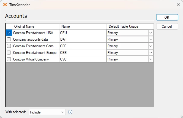 - Select the accounts from which you want to retrieve data. In the With selected list, click Include to use the selected accounts in the data warehouse, or click Exclude to exclude the selected accounts and include all other accounts. The last option is helpful if you frequently add new accounts in Dynamics AX and want to ensure that all accounts are included in the data warehouse as soon as they exist in the ERP system. Note that the exclude option isn't available when you use the OData provider.