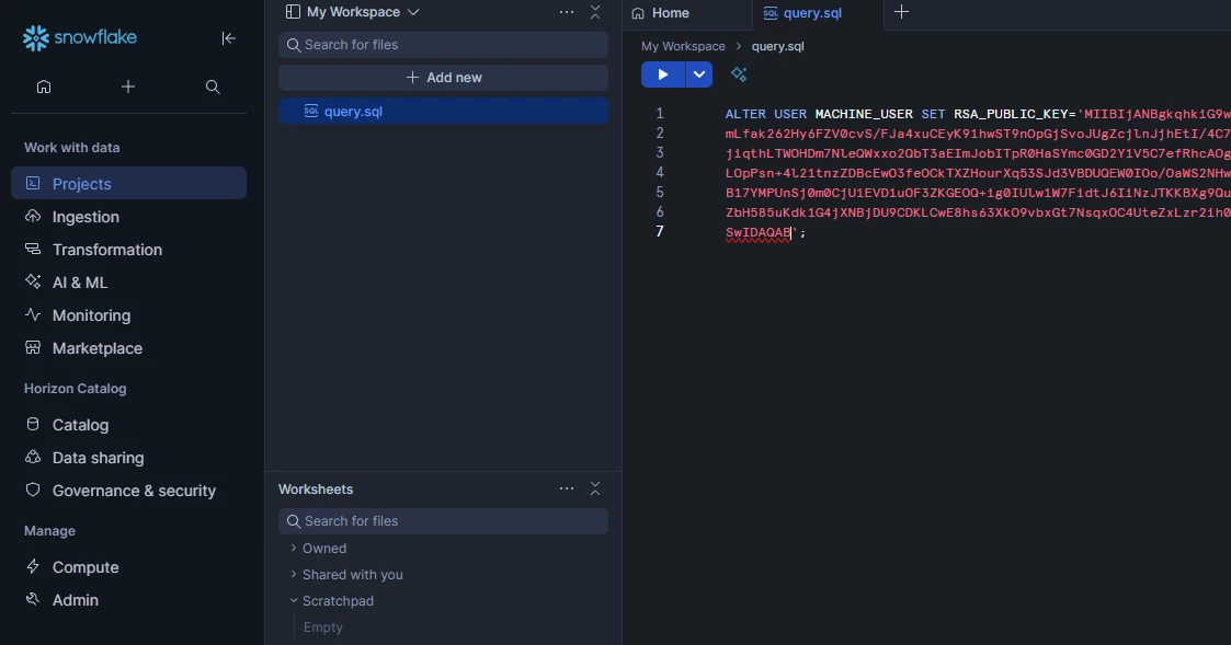 Now click on Projects. Create a new SQL file and give it a name. I called it query. I added the following query to make it use the public key for access. Do not add all the content, only the part after -----BEGIN PUBLIC KEY----- and before -----END PUBLIC KEY-----.