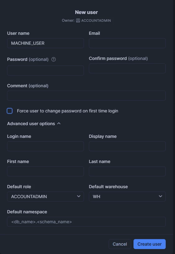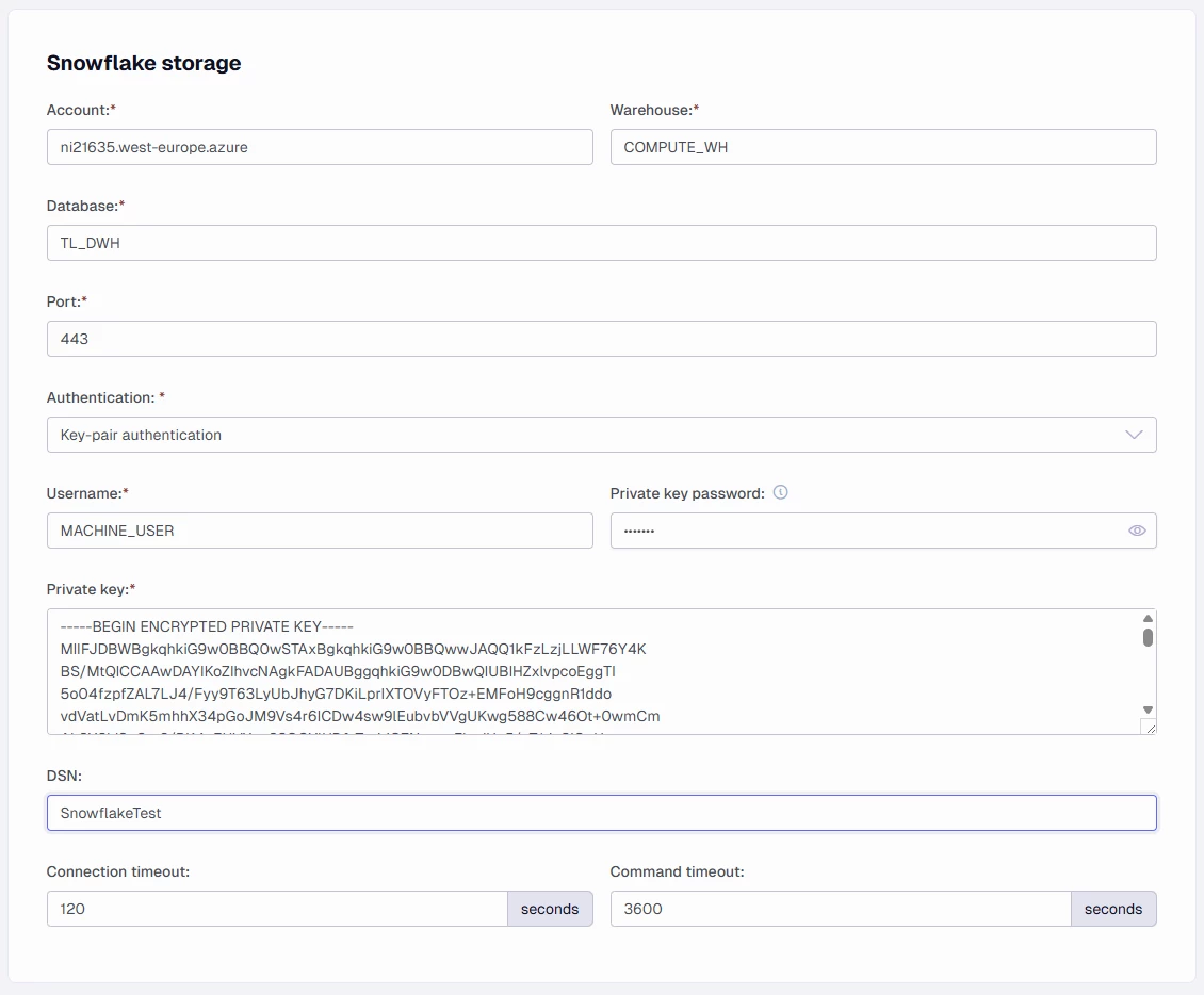 Now you can use the MACHINE_USER account to authenticate your create and read commands towards Snowflake.