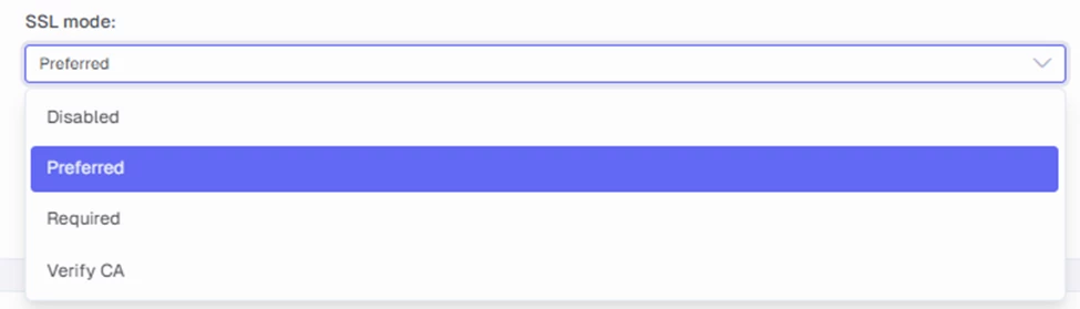 - Preferred: (Default) | Use SSL if the server supports it, otherwise falls back to unencrypted.