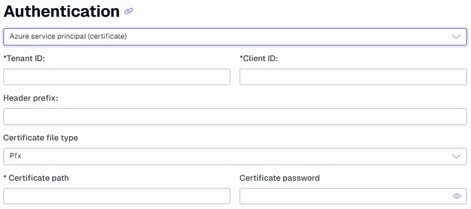Azure service principal (certificate) This authentication is specialized for azure service principals that uses certificates for authentication, instead of the more common way of using a client secret.