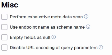 Use endpoint name as schema name: This feature will add the name of the endpoint as the schema name. This is beneficial when the data source returns data with the same format despite using different endpoint paths. Be aware that if this is checked after the initial synchronize task has been done it will generate a new table in the data source.