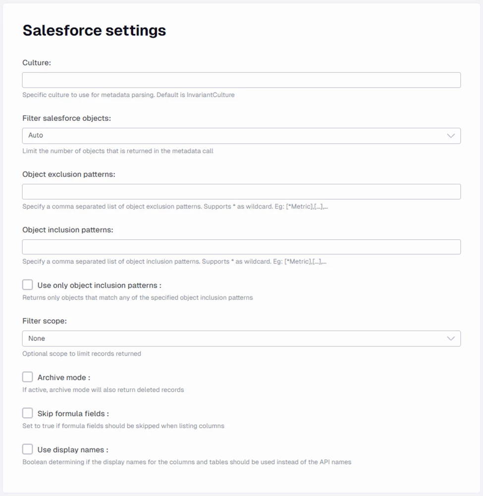 Define the culture for when reading the data pulled from Salesforce. It can be important regarding decimals and datetimes, for example. Usually, it should be left blank.