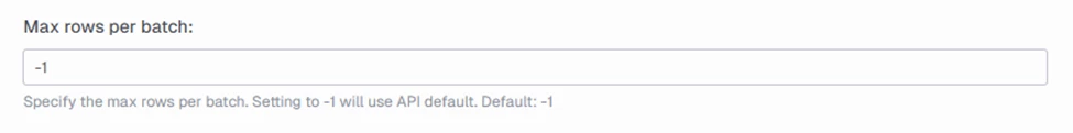 If you want to specify the number of rows returned per batch/page, you can do so here. The default will use the API default, which is returned based on the total size of the data. Per day of release, that size is 2GB. So there will be no pagination before data exceeds 2GB in size (regardless of the number of rows).