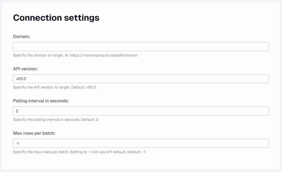 When the connector pulls data using Bulk 2.0 API, it first creates a query job, then it needs to poll the status of the query job until it returns that it is completed before it can pull any data. For small tables, this might be instant, but for larger tables (100k++), it might be smart to increase this interval. Each poll consumes 1 request of the request quota. There is a max of 10 polling attempts, so adjust your polling interval accordingly.