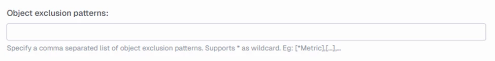 Here, you can provide a list of objects or patterns to exclude/filter from your metadata call. Use this if there are objects that you know you do not need.