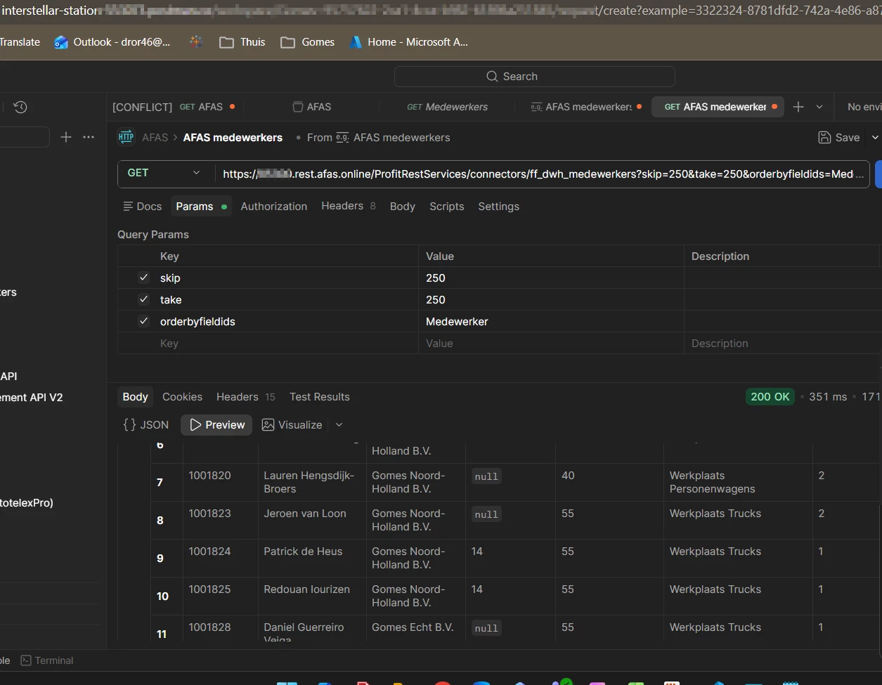 https://<>.rest.afas.online/ProfitRestServices/connectors/<connector>?skip=250&take=250&orderbyfieldids=Medewerkerskip = Offset. in the example above skip the first 250 rows