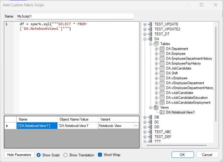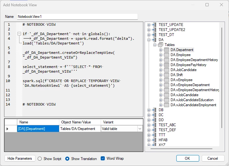For Prepare instance on Fabric Lakehouse storage, a special type of view is available. Unlike the Fabric-flavor of custom views that are only accessible through the SQL endpoint and cannot be used in custom scripts or transformations, Notebook views work more like regular custom views.