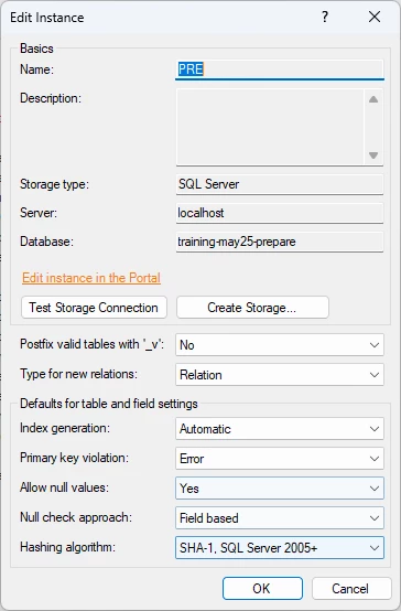- Right click the instance in the Solution Explorer and click Edit Instance. In the Hashing algorithm list, click SHA-1, SQL Server 2005+, then click OK.