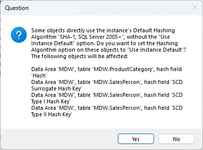 - In the window that pops up, click Yes to change the hash algorithm on the objects that use ‘SHA-1, SQL Server 2005+’ to ‘Use instance default’.