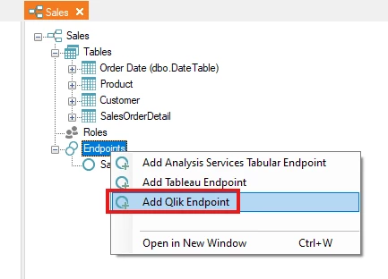 Next, double-click on the Semantic Model to open it, and then right-click on the Endpoints node and select “Add Qlik Endpoint”.
