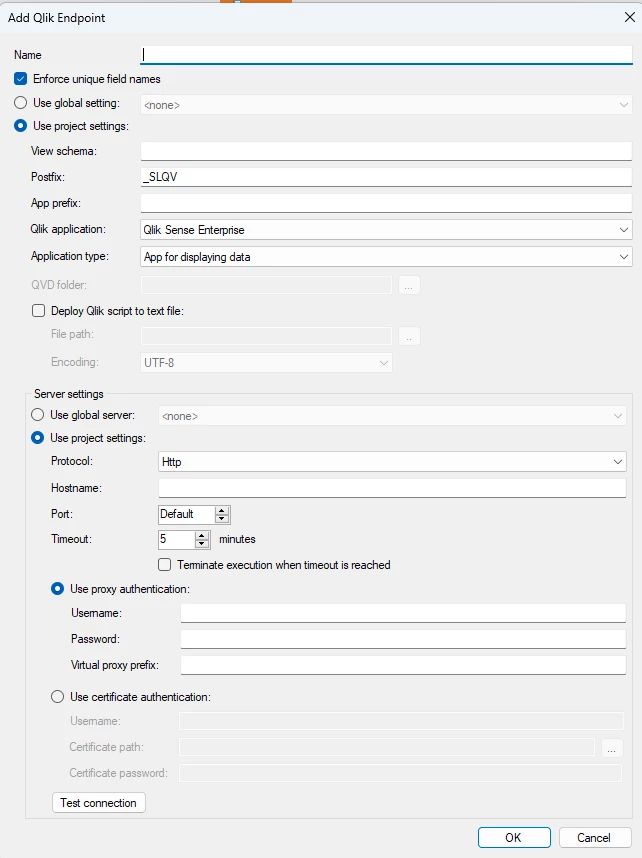 Options needed for connecting to Qlik Enterprise