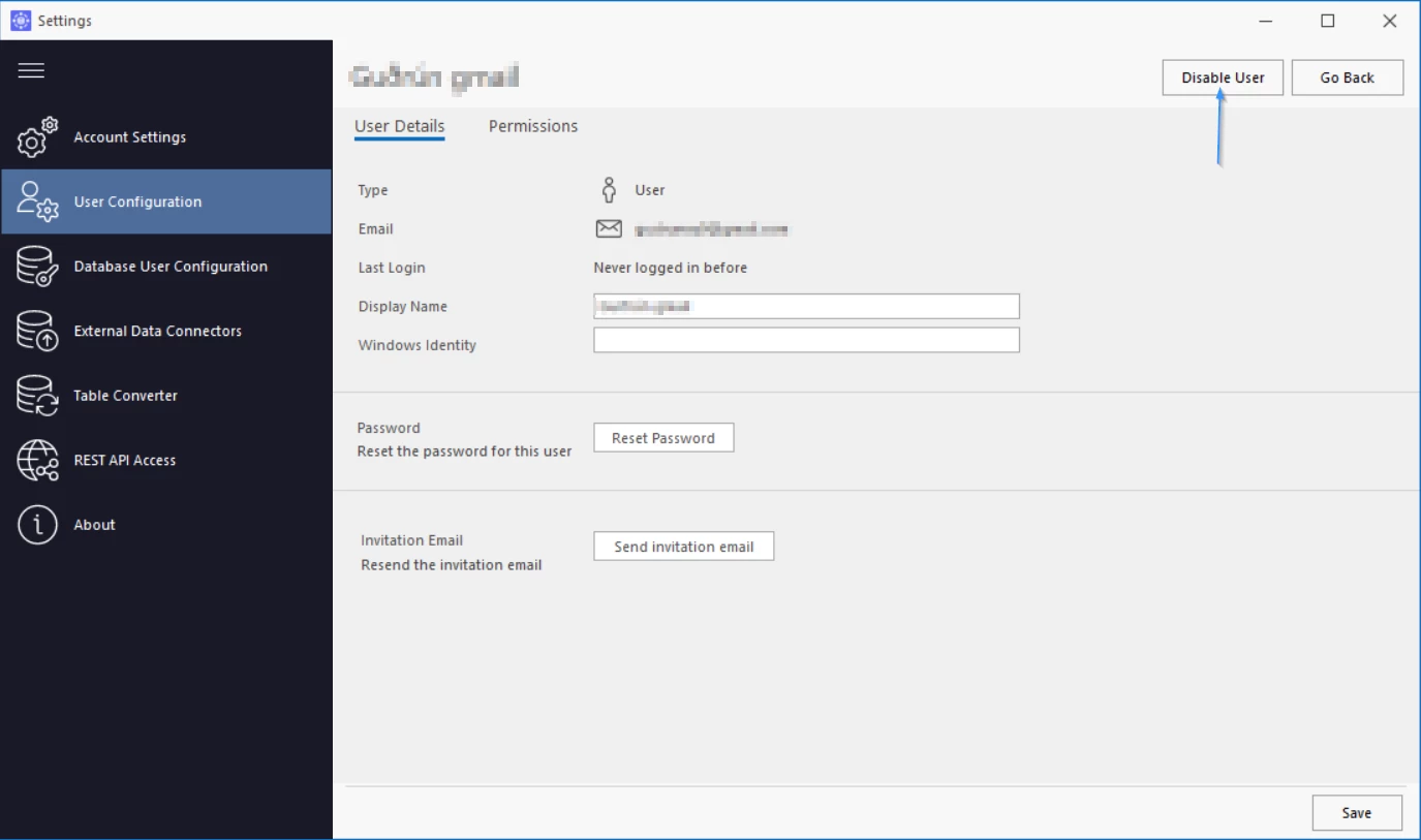 • Toggle the User Enabled checkmark to enable/disable access