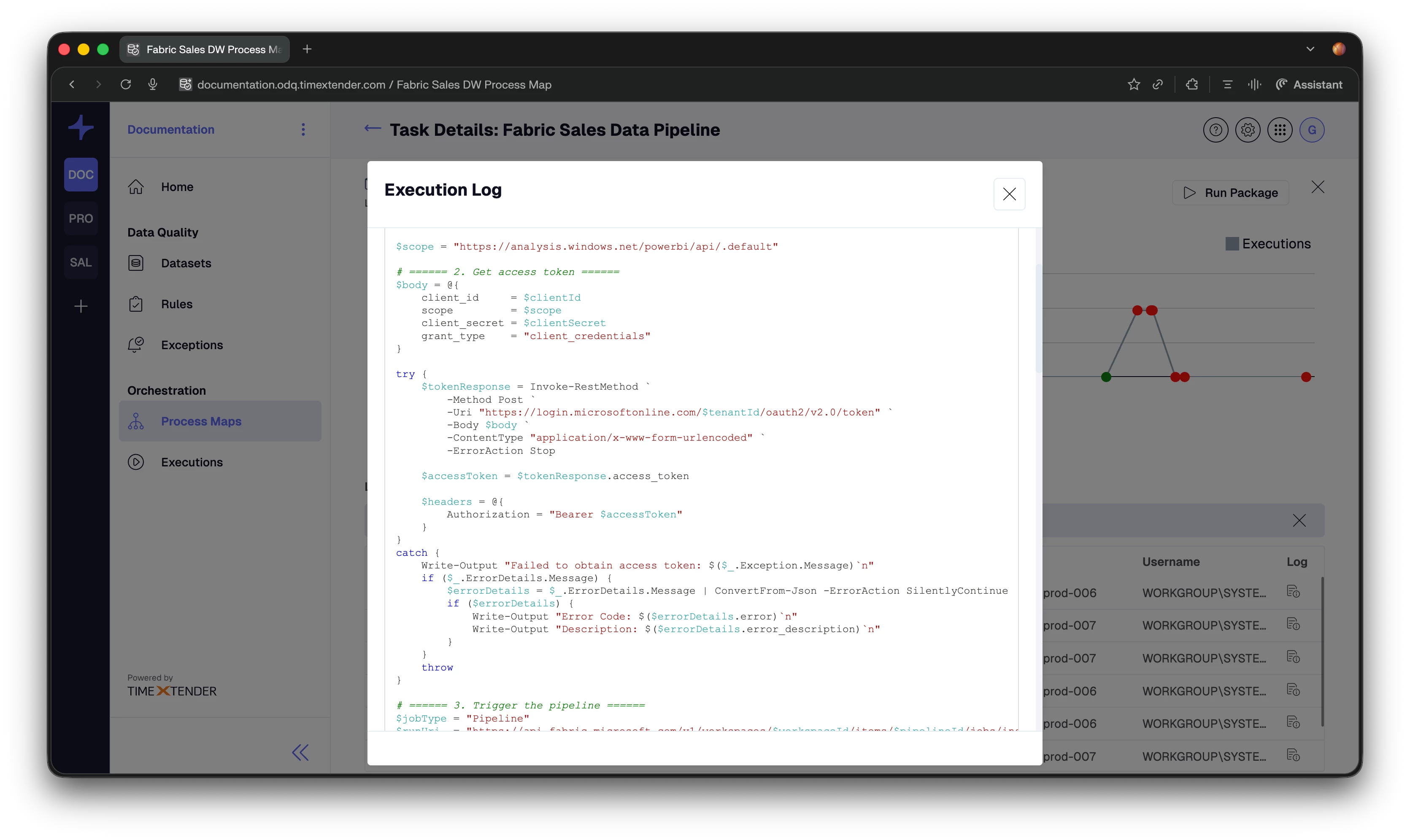 - Log tab: Shows the full execution log, including error messages, stack traces, and other technical output. Use this when you need to copy error details, open a support ticket, or investigate low-level technical behavior.