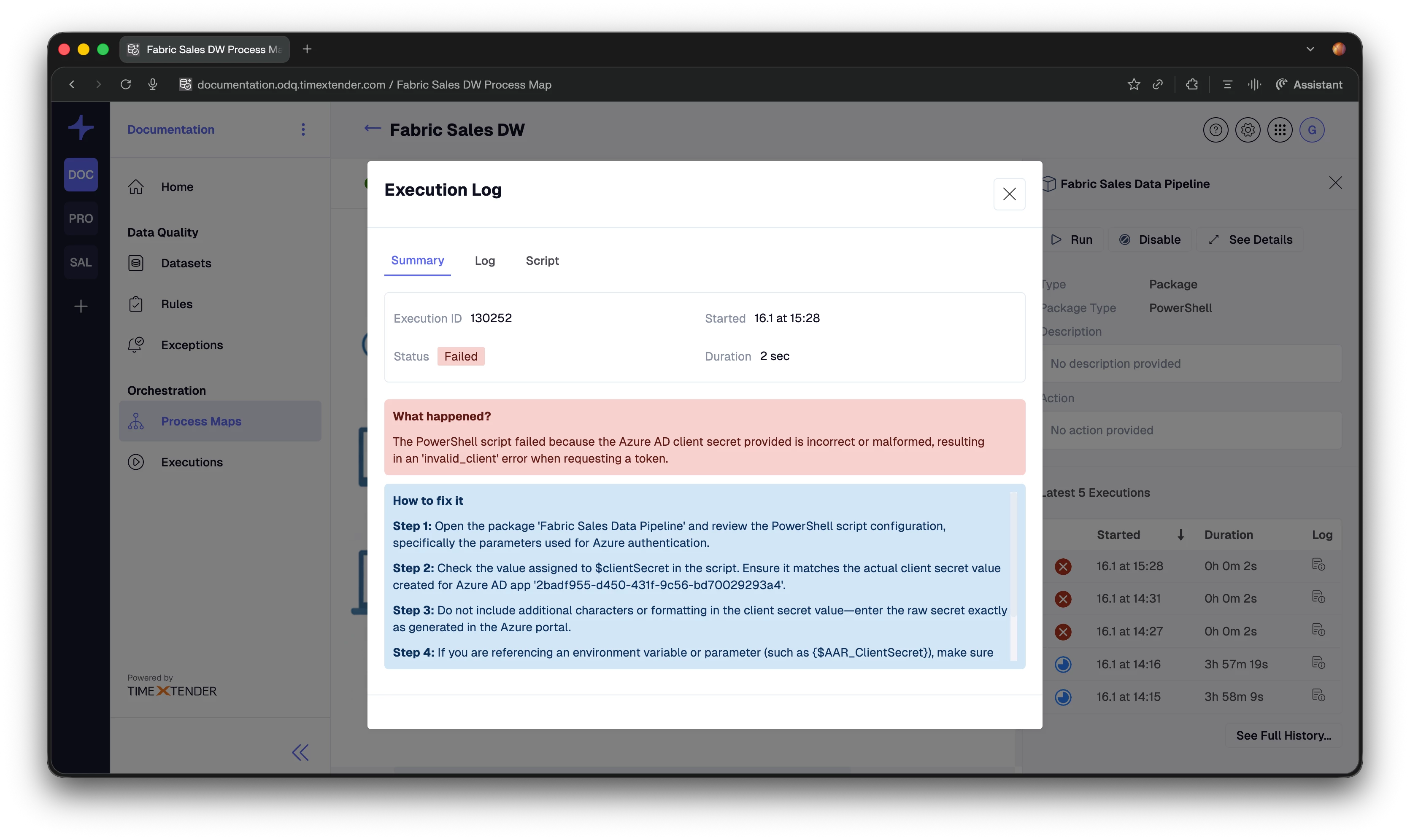 Xpilot Error Insights for Orchestration is an AI-Powered Execution Log Analysis is a feature in TimeXtender Orchestration that uses artificial intelligence to analyze failed package executions and explain what went wrong in clear, plain language. Instead of reading through raw logs and stack traces, you get a concise summary of the root cause and concrete steps to fix the problem, plus access to the underlying log and, when available, the script that was running.