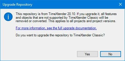- When the application detects a repository from a version of TimeXtender 20.10 that can be upgraded, you will be asked if you want to upgrade the repository. Click 'Yes' and the upgrade will continue as usual. During the upgrade, unsupported features and objects will be removed or converted as listed in the previous section.