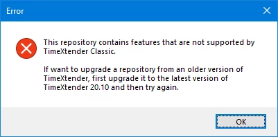 - Upgrade to the latest version of TimeXtender 20.10 to ensure you are on a version that can be upgraded to TimeXtender Classic. If you try to upgrade a repository from a version that is too old, you'll see an error message in TimeXtender Classic when you attempt the upgrade.
