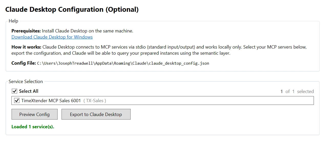 - Click Export to Claude Desktop to configure the stdio connection