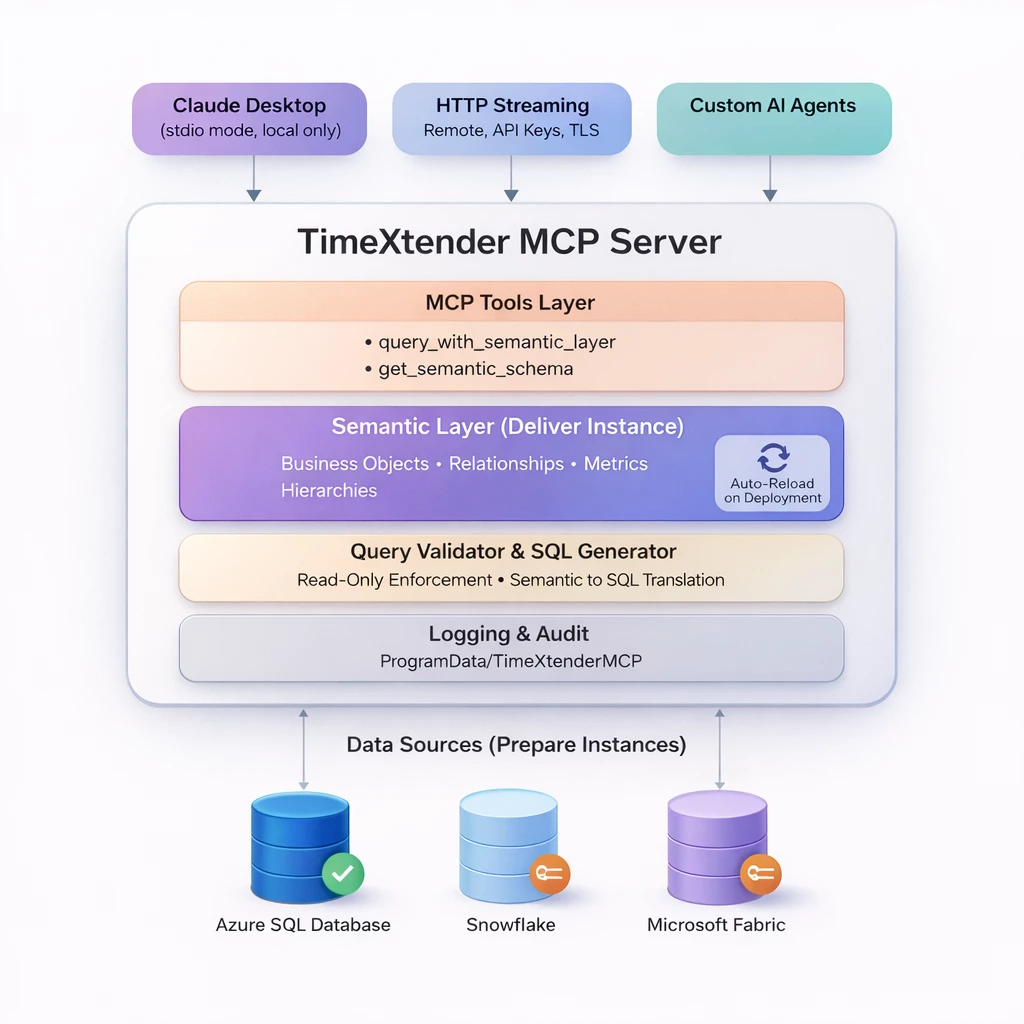 - Data Sources (Prepare Instances): The MCP Server connects to Prepare instances running on Azure SQL Database, (Snowflake and Microsoft Fabric coming soon) using read-only credentials. AI clients connect through either local stdio mode (Claude Desktop, local development) or remote HTTP streaming with API keys and TLS (production deployments, custom agents).