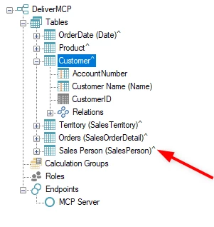 In the TimeXtender Semantic Model, tables and fields that have a description are displayed in the UI with a caret (^) suffix next to their name. This serves as a visual indicator of the contextual completeness of the metadata available to the AI model.